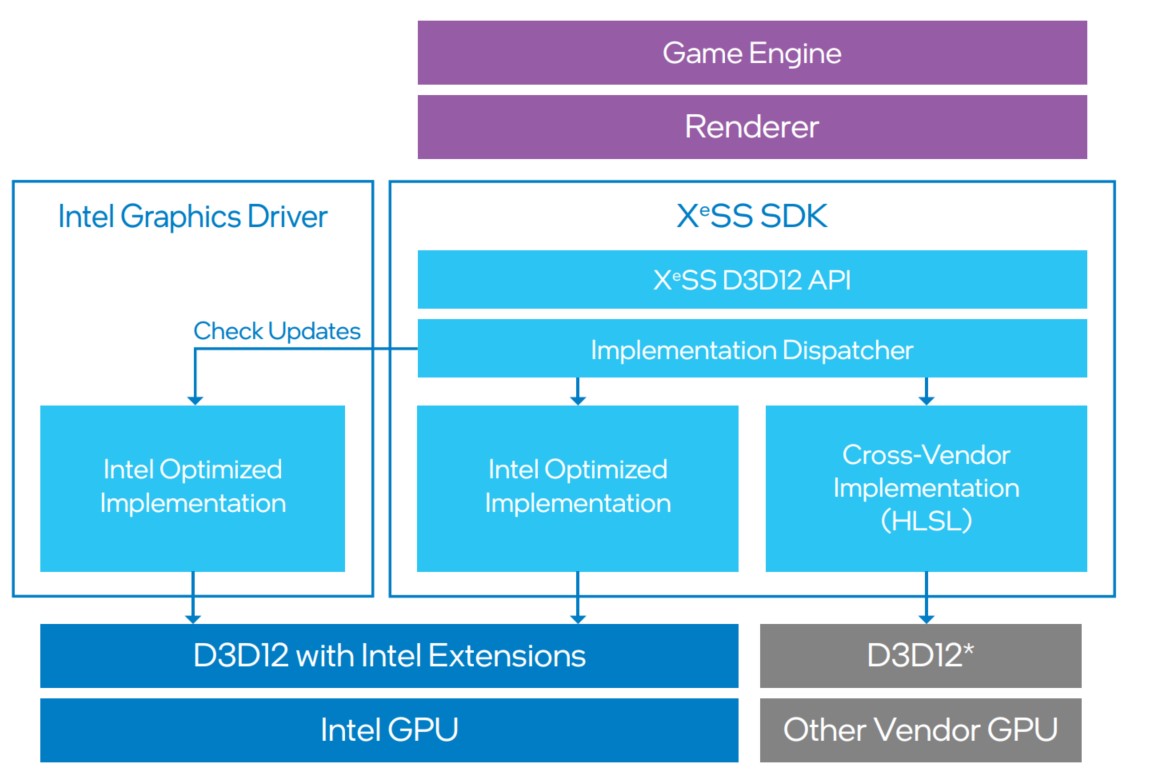- An implementation dispatcher, which loads either the XeSS runtime shipped with the game, the version provided with the Intel graphics drivers, or the cross-vendor implementation.