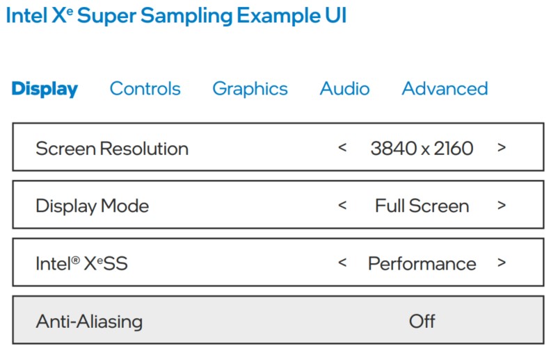 Note: All Intel Xe Super Sampling settings should be exposed to a user through a selection menu, if supported, to encourage customization.