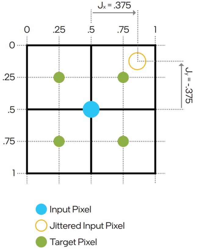 The jitter applied to the camera results in a displacement of the sample points in the frame, as shown below, where the target image is scaled 2x in width and height. Note that effective jitter is negated with respect to (J_x, J_y), because the projection matrix is applied to geometry, and it corresponds to a negative camera jitter.