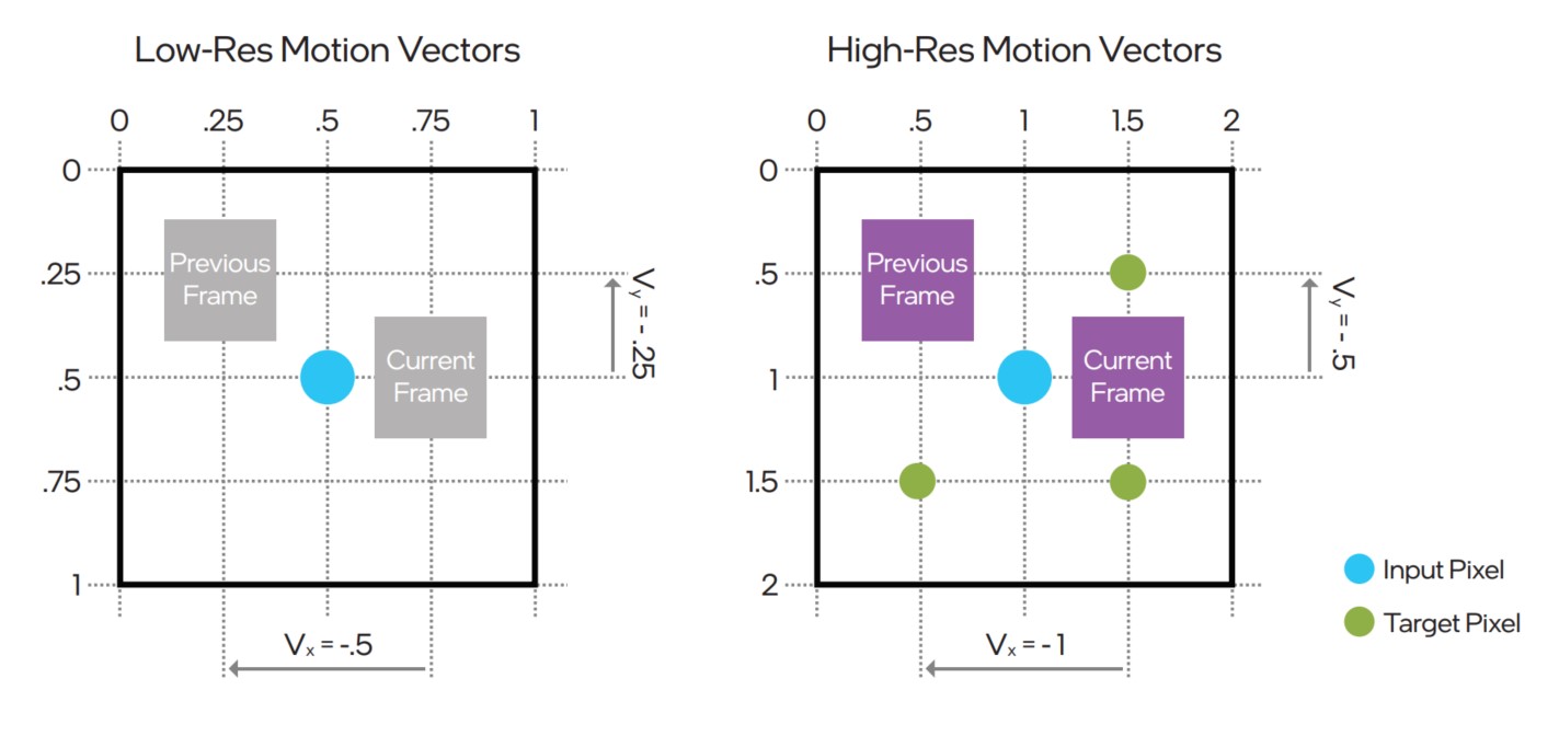 In place of the high-res motion vectors, the renderer can provide the motion vectors at the input resolution—along with the depth values: